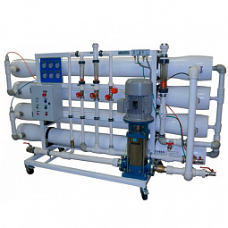 В комплектацию входит 10 мембранных элементов 8040, насос высокого давления, щит управления с функционалом контроля стадий работы, флэш-мойкой и кондуктометром для контроля качества воды на выходе.
